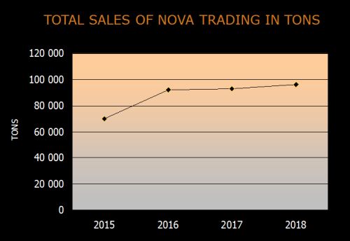 Graf znázorňuje vývoj firmy Nova Trading S.A. – nárůst prodeje korozivzdorné oceli a hliníku v tunách během několika let.