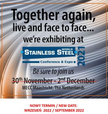 W dniach 30.11-02.12.2021 miały się odbyć w Maastricht targi Stainless Steel World 2021 - jedno z najważniejszych wydarzeń targowych dla branży stali nierdzewnych. Niestety z uwagi na pandemię rząd Holandii wprowadził częściowy lockdown, który uniemożliwił organizację tej imprezy. Targi te zostały przeniesione na wrzesień 2022.Targi Stainless Steel World – Expo & Conference, na których wystawiają się producenci i dystrybutorzy stali nierdzewnej z wielu krajów z całego świata, odbywają się w Maastricht w Holandii co dwa lata. Ostatnia edycja tej imprezy odbyła się w dniach 26-28.11.2019 r.